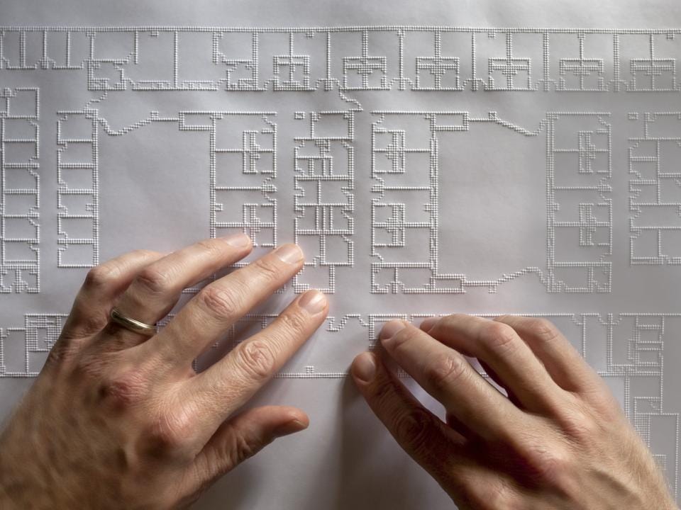 Downey, kabartmalı çizimler ve büyük formatlı kabartma baskıları okuyarak çizimleri inceler, ardından parmak uçları ve bastonuyla zihinsel bir model oluşturur. Mekanları seslerine, malzemelerin gürültüyü yansıtma veya sönümleme özelliklerine ve kenarların ve dokuların harekete nasıl yön verdiğine göre değerlendirir. Bu yöntem, onun dokunsal planları izlediğini, mekansal ipuçlarını dinlediğini ve dolaşımı işitsel ve dokunsal olaylar dizisi olarak tanımladığını gösteren profiller ve röportajlarda belgelenmiştir.