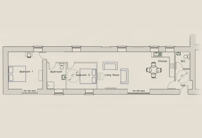 In einem Landhaus sind die Räume so angeordnet, dass nicht abstrakte Symmetrie, sondern Funktionalität, Wärme und Privatsphäre im Vordergrund stehen. Eine der beständigsten Anordnungen in England ist eine dreiteilige Anordnung um einen Durchgangskorridor herum: an einem Ende ein Servicebereich für Lagerung und Vorbereitung, in der Mitte ein Salon oder Wohnbereich zum Heizen und Beisammensein und an einem eher privaten „oberen” Ende ein Bereich zum Schlafen und für repräsentative Zwecke. Schutzstudien und Leitfäden beschreiben diesen Querkorridorplan als ein charakteristisches Merkmal lokaler Häuser, das sich über Jahrhunderte hinweg angepasst hat, ohne die grundlegende Hierarchie zu verlieren, die den Ablauf des täglichen Lebens ermöglicht.