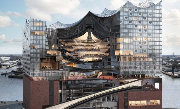 Die 2017 in Hamburg eröffnete Elbphilharmonie von Herzog & de Meuron steht auf einem alten industriellen Backsteinsockel und symbolisiert mit ihrem wellenförmigen Glaskonzertsaal, der sich fast schon rituell zur Elbe hin öffnet, die Verbindung zwischen Vergangenheit und Zukunft. Das Innendesign mit einer „Weinberg“-Ebene, die die Musikplattform umgibt, fördert eine vertraute Verbundenheit zwischen Künstlern und Zuschauern und verwandelt jedes Konzert in eine Zeremonie, bei der Klänge und Stille geteilt werden.