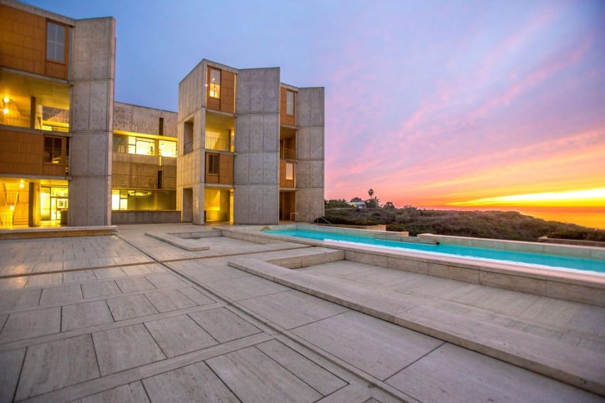Das von Louis Kahn entworfene und 1965 in La Jolla, Kalifornien, eröffnete Salk Institute besteht aus zwei parallelen Gebäuden, die einen schmalen Innenhof mit Blick auf den Pazifik umgeben, und wurde als Ort des wissenschaftlichen Denkens und der Laboratmosphäre konzipiert. Kahn beschrieb sein Werk als einen „Naturtempel”, der durch das von oben einfallende Licht und die Konzentration der Betonoberflächen eine zeitlose Atmosphäre schafft, die den Dialog zwischen Geist und Kosmos fördert.