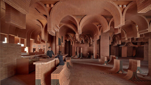 Der Innenraum weist eine Vielzahl von strukturierten Oberflächen auf, darunter raue Ziegel und weiche Stoffe, die an eine natürliche Landschaft erinnern. Formen und Kurven fließen durch den Raum und schaffen eine dynamische und ansprechende Umgebung für die Gäste.