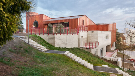 Die für den neuen Anbau verwendete Kupferverkleidung hebt sich von der ursprünglichen Betonstruktur ab, ohne die architektonische Kohärenz zu beeinträchtigen. Diese sorgfältige Materialwahl fördert den Dialog zwischen Alt und Neu, so dass beide Elemente des Gebäudes harmonisch wirken.