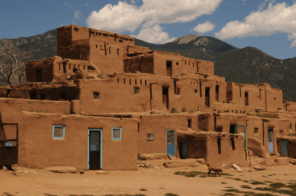 In trockenen Klimazonen, wo es kaum Holz gibt, dominieren Lehm, Lehm und Stein. Von Moscheen in Mali bis zu Andendörfern in Peru drücken dicke Lehmwände Beständigkeit und soziale Identität aus. Die mehrstöckigen Lehmziegel-Pueblos in Nordamerika (im Bild Taos Pueblo) entstanden beispielsweise dort, wo lehmhaltige Böden im Überfluss vorhanden waren, und ihre warmen braunen Wände stehen im Einklang mit den kulturellen Werten der Bewohner.