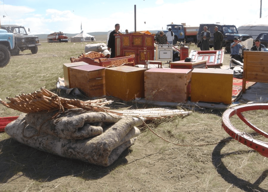 Demontierte Jurten-Teile auf einem mongolischen Festival demonstrieren die Mobilität nomadischer Unterkünfte. In solchen Gesellschaften ist das „Zuhause“ buchstäblich eine Reise; Lebensräume werden bei jeder Bewegung eingerichtet und wieder entfernt.