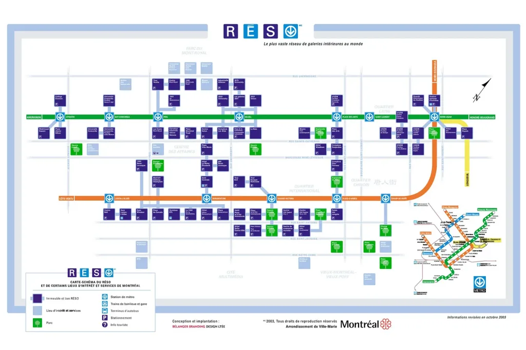 Montreal’s RÉSO is a climate-adapted pedestrian network interwoven with the metro and major buildings. The network spans 32 to 33 kilometers, connecting universities, retail stores, offices, and cultural venues, enabling people to move and gather regardless of winter storms or summer heat. What began as corridors beneath the city center has evolved into a clear, multi-layered urban structure.