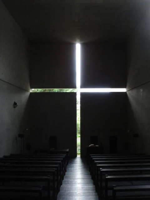 Ando’s Church of Light (Osaka): A cross-shaped opening lets in a beam of sunlight that enlivens the simple concrete interior.