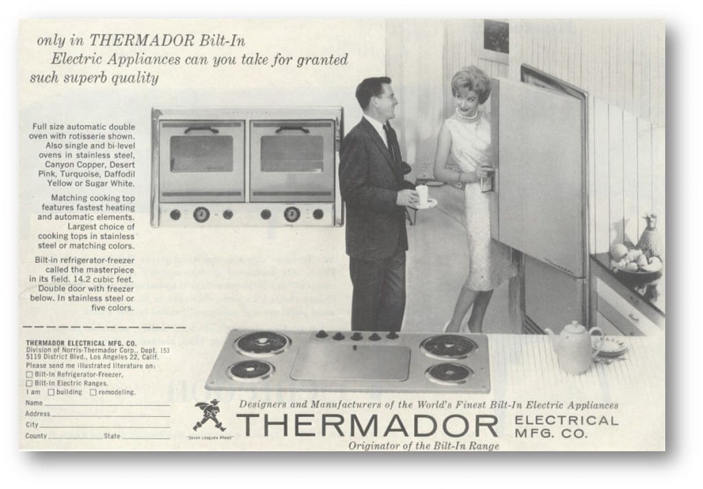 After World War II, this idea became widespread. Manufacturers introduced wall ovens and separate stove eyes that replaced single stoves; in the US, Thermador marketed a wall oven and a matching stove eye in 1947. In the UK, companies such as Hygena popularized modular kitchens for post-war homes, and in the late 1960s/70s, glass ceramic stove tops became widespread, offering flat, easy-to-clean work surfaces.