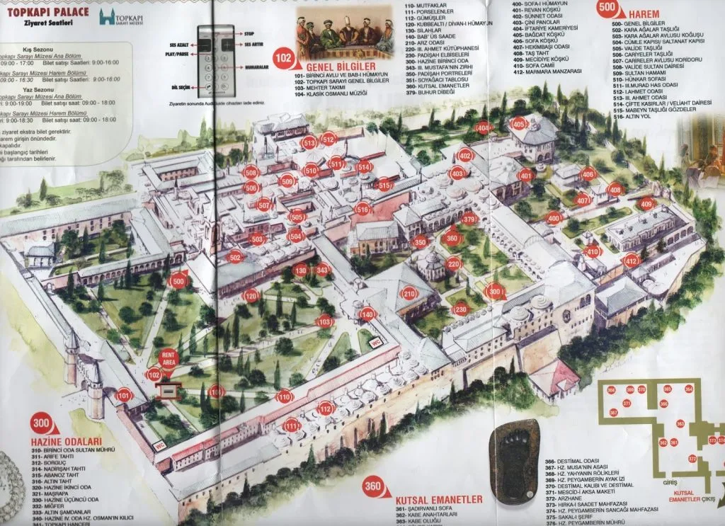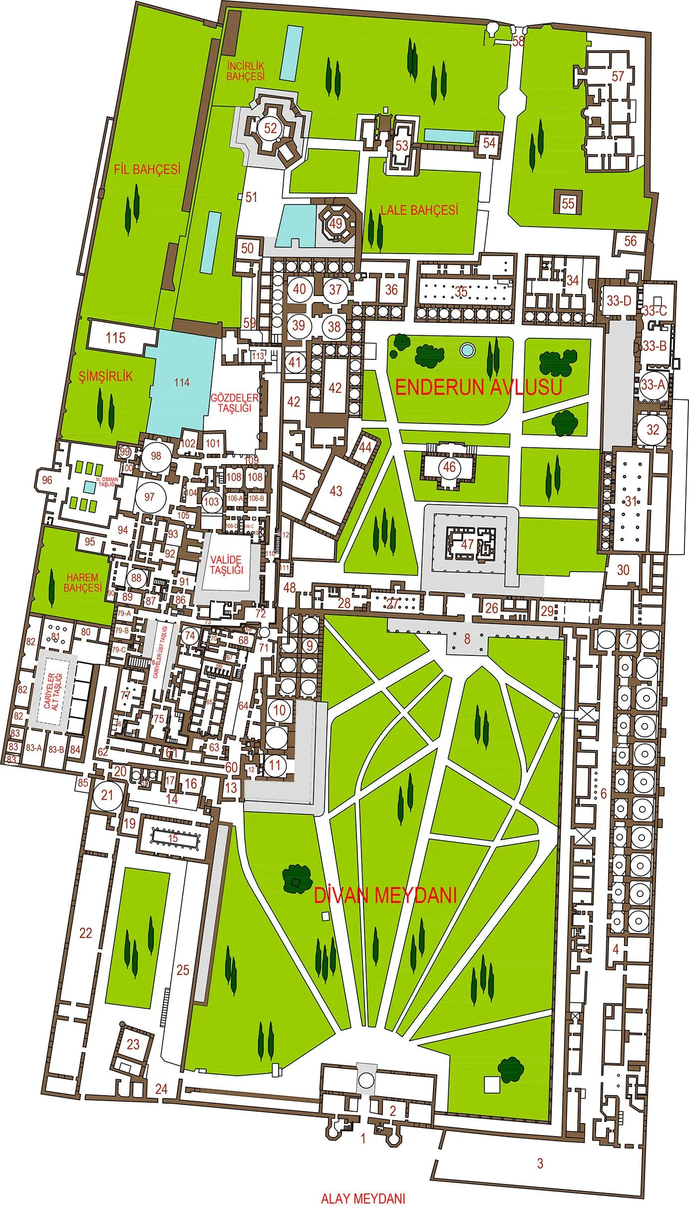 1. Complex Plan: The complex plan of Topkapi Palace includes many courtyards, gardens and buildings. This plan is designed in harmony with the narratives, details and functions of Ottoman architecture. Visitors can witness the historical and cultural layers of the palace as they wander through the different structures and spaces.