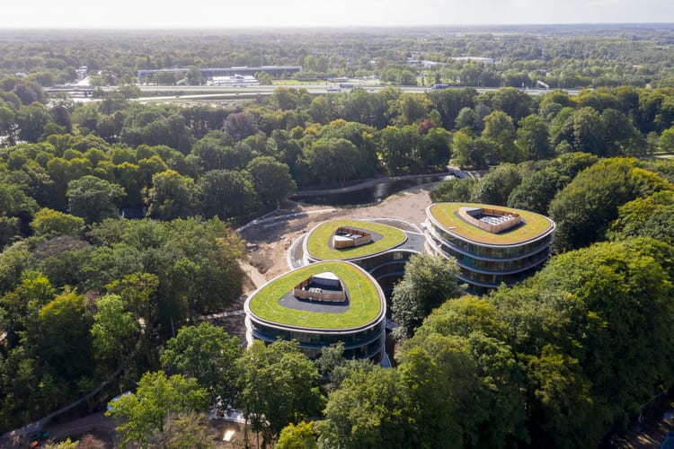 RAU Architects ha entregado una oficina de madera diseñada como banco de materiales. La estructura se ha ensamblado con tornillos en lugar de adhesivos, por lo que se puede desmontar y reutilizar. El pasaporte de materiales alojado en Madaster documenta qué se ha montado y dónde. La estructura de madera almacena aproximadamente 1633 toneladas de CO2 y el edificio ha obtenido la certificación BREEAM Outstanding, lo que demuestra su rendimiento medioambiental y de documentación.