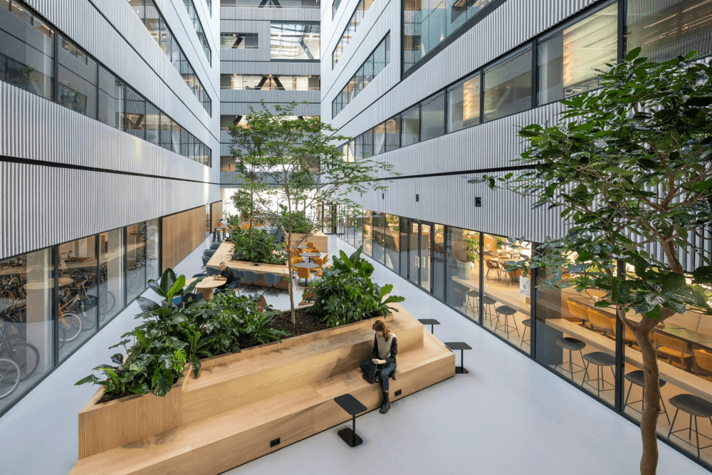 El interior de Matrix One en Ámsterdam, un edificio de oficinas de 2023 diseñado para ser desmontado por completo. Casi todos los componentes (estructura, fachada, accesorios) de este edificio de seis plantas son desmontables y están documentados para su futura reutilización. En colaboración con Madaster, el equipo de MVRDV creó pasaportes digitales de materiales para más de 120.000 componentes y calculó que el 90% de los materiales podrían recuperarse y revenderse una vez finalizado el uso del edificio. Estos proyectos demuestran cómo los modelos BIM y las bases de datos se combinan para permitir el seguimiento de materiales a gran escala en la práctica.