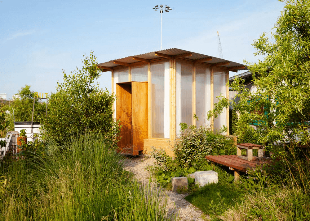 Pabellón circular modular (Studio ACTE, 2021): diseñado como un kit de piezas que pueden desmontarse fácilmente y reconstruirse en otro lugar. La estructura de madera y los paneles de policarbonato están atornillados sin utilizar adhesivos, lo que demuestra un enfoque a pequeña escala de la reutilización modular.