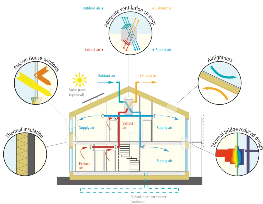 - Isolation et étanchéité à l’air pour minimiser les pertes ou les gains de chaleur.