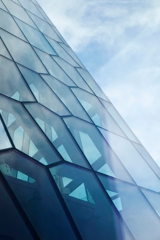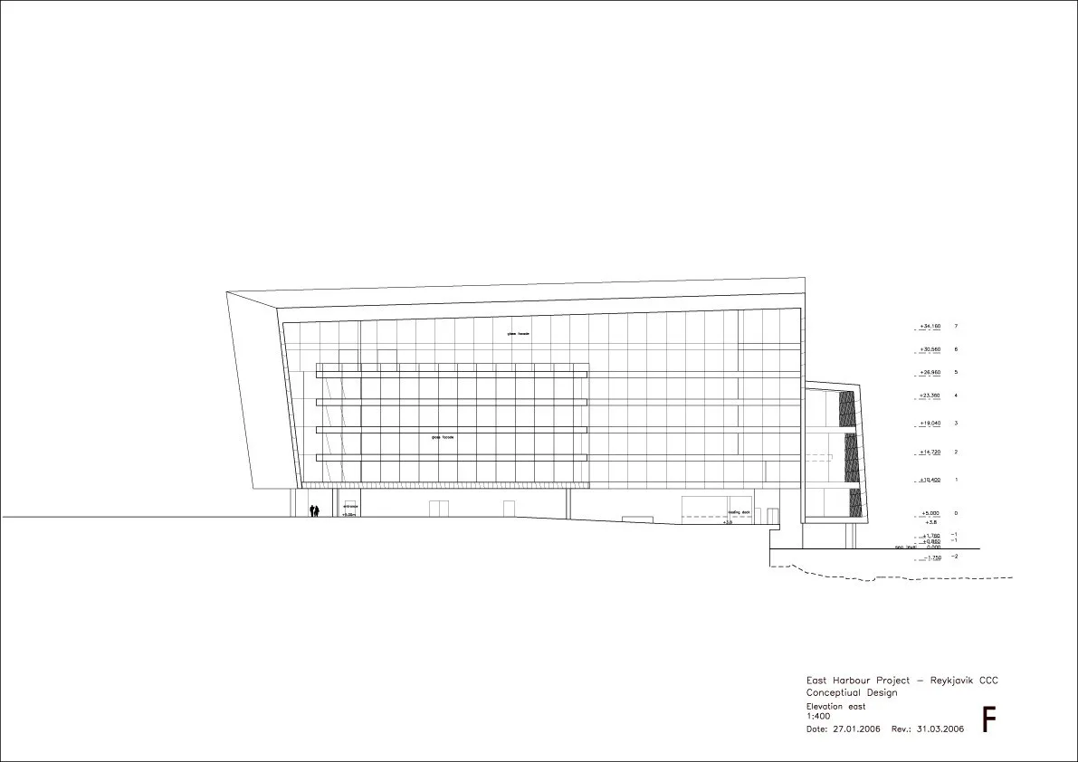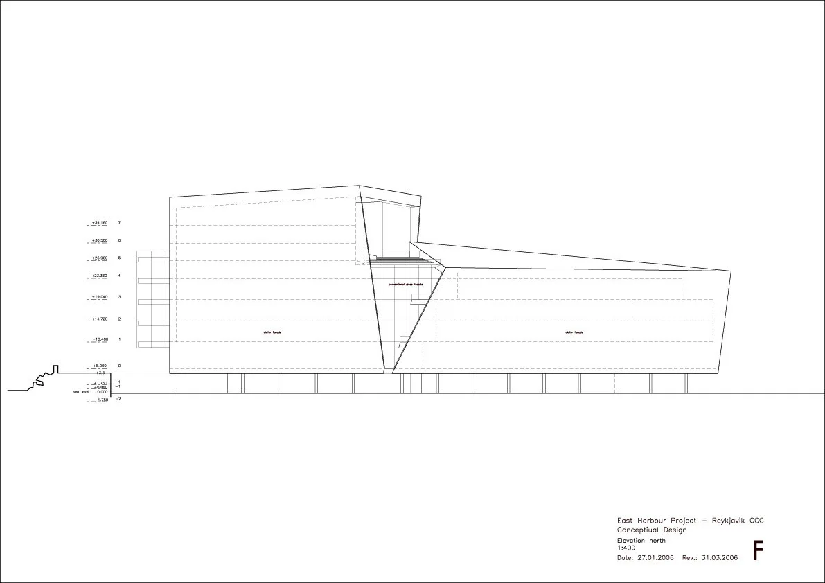 Yapının güney cephesi, 12 taraflı modüllerin bir araya getirilmesiyle oluşturulmuştur. İzlanda’da yaygın olarak bulunan kristalize bazalt sütunları andıran altıgen cam form, şehrin yansımalarını oluşturmaktadır Çok yüzlü cam cephe, iki ve üç boyutlu olarak gerçekleştirilen bir geometrik ilkeye dayanıyor. Bu sayede cephe, liman ve gökyüzünden aldığı ışıkları yansıtan boşluk tasarlanmıştır. Yapının diğer cephelerinde ise bu geometrik kompozisyonun iki boyutlu hali kullanılmış.