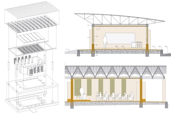 Il primo progetto di Francis Kéré è nato da una domanda semplice, che avrebbe potuto porre anche un bambino: come si può realizzare un’aula fresca e luminosa con pochissimi soldi? La risposta era: terra locale, ombra e aria. Blocchi di argilla compressa, un ampio tetto a falde rialzato e aperture sapientemente posizionate hanno creato un effetto camino che favorisce la ventilazione incrociata e fa uscire l’aria calda e entrare quella fresca. La costruzione è stata realizzata insieme alla comunità, le competenze sono state trasmesse e sono diventate motivo di orgoglio, così che la scuola non è solo un luogo di apprendimento, ma anche un modo per imparare facendo.