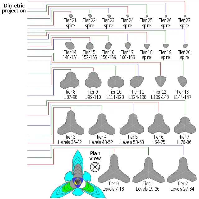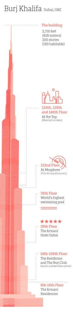 - Segmentazione verticale del Burj Khalifa: il Burj Khalifaè segmentato da sky lobby ai piani 43, 76 e 123, ognuno dei quali offre servizi come piscine e sale relax. Questi spazi fungono da destinazioni all’interno della torre, fornendo un rilievo visivo e spaziale e rendendo il percorso verticale più vario e coinvolgente.