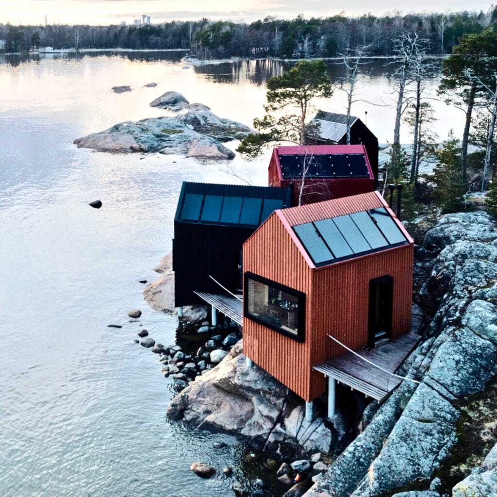 フィンランドのMajamajaキャビンは、隠遁地として、花崗岩の上に建てられ、屋根の太陽光発電で電力を供給し、コンパクトな乾式トイレと水システムを使って環境への影響を抑えながら、視野を広げています。これらは、分散型でインフラの少ないライフスタイルの沿岸部における先駆けです。