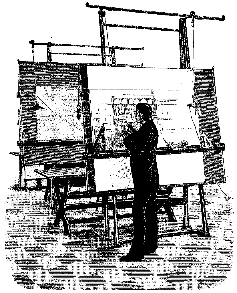 Bu ahşap gravür, 25 Mayıs 1893 tarihinde Norveç’in önde gelen mühendislik dergisi Teknisk Ukeblad‘da yayınlanmıştır. Bu gravür, J. M. Voith firması tarafından Heidenheim a. d. Brenz (Güney Almanya) şehrinde piyasaya sürülen yeni bir tür dik çizim tahtası hakkındaki bir makaleyi resimlemektedir. Tahtanın boyutları 1800 x 1250 mm, toplam yüksekliği 2800 mm ve ağırlığı 220 kg’dır.