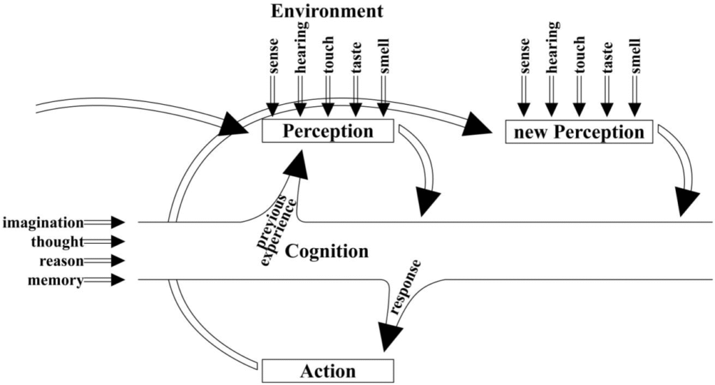 Bu şema, algılama, biliş ve eylem döngüsünü görselleştirir — insanların çevreleriyle nasıl etkileşime girdiklerini, bilgileri nasıl işlediklerini ve deneyimler yoluyla nasıl yeni anlayışlar geliştirdiklerini gösteren bir modeldir.