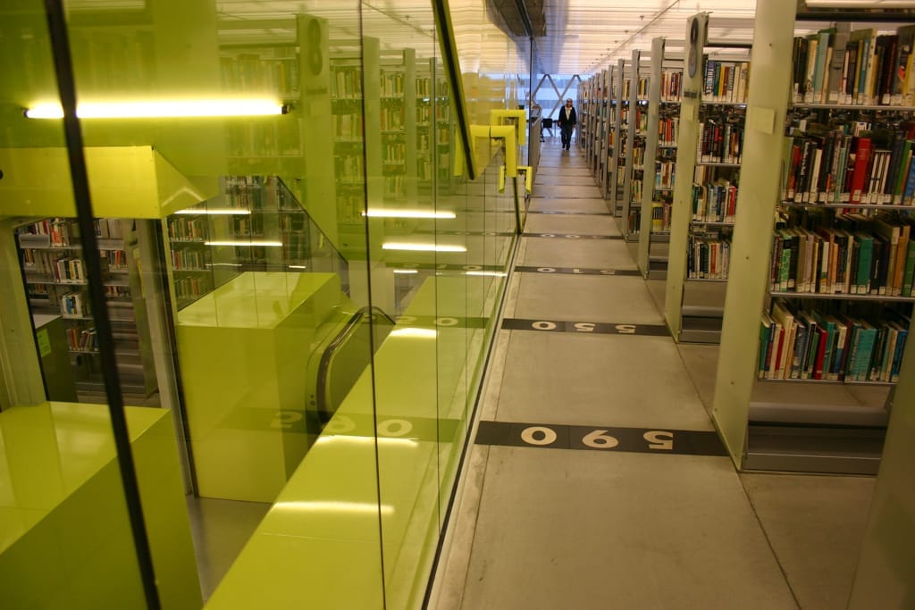 İçeride, ana alanlar genel odalar yerine kamusal yaşamın farklı iklim bölgeleri olarak ele alınmıştır. Sokak seviyesindeki Oturma Odası, şehre bakan yüksek, şeffaf bir salondur. Oturma alanları, kafe ve rahat okuma alanları, kütüphaneyi uzman bir kurumdan ziyade kentsel bir yaşam alanı olarak çerçevelemektedir. Daha yüksekte bulunan Karıştırma Odası, kullanıcılar ve kütüphanecilerin yoğun bir masa ve ekran alanında buluştuğu, referans yardımının merkezi ve görünür olduğu bir bilgi ticaret alanı olarak tasarlanmıştır. Onların üzerinde, Kitap Spirali, dört kat boyunca kesintisiz, hafif bir rampa üzerinde kurgusal olmayan kitap koleksiyonunu sarmal şeklinde dizerek, Dewey düzenini katlara bölmeden korur ve kitaplara göz atma eylemini yavaş bir mimari gezintiye dönüştürür. Bu bölgeler birlikte, davranış ve anlatıya göre bölgelere ayırmanın, basit kat numaralarına göre bölgelere ayırmaktan daha etkili olabileceğini gösterir.